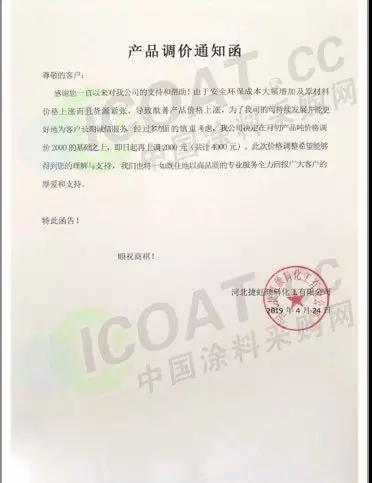 受各方面影響,近期已經有企業持續發布漲價函,據了解,4月24日,河北捷虹顏料化工有限公司發布《產品調價通知函》稱:考慮到近期安全環保成本大增以及原材料持續上漲且貨源緊張,導致很多原材料產品上漲,公司決定在月初產品2000元/噸的基礎上再上調2000元/噸,報價4000元/噸。