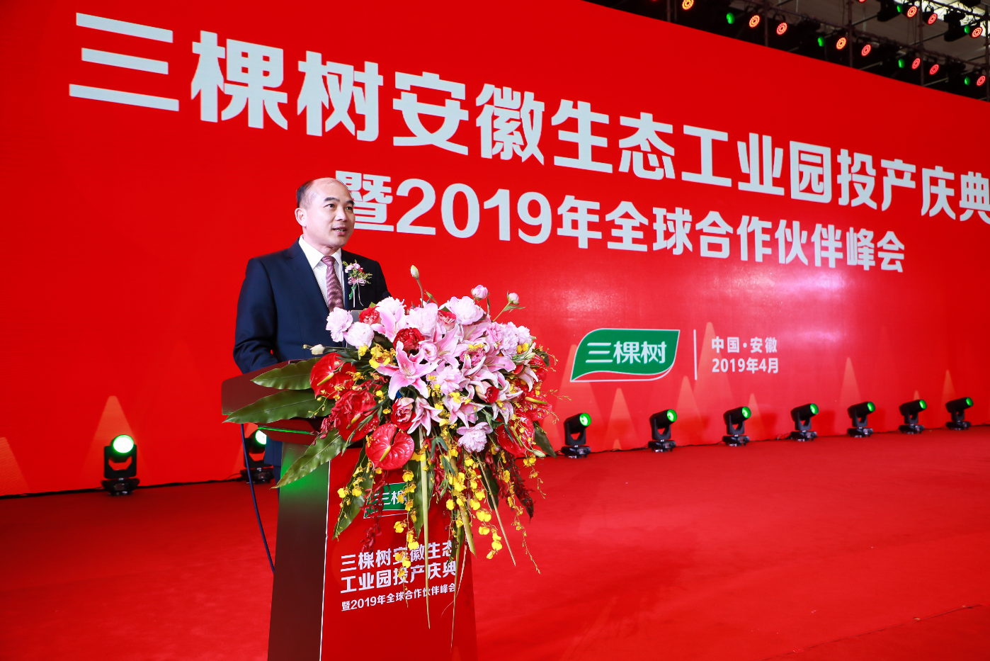 古樹綠意蔥蘢,湖泊碧波蕩漾,四月的三棵樹安徽生態工業園一派欣欣向榮。在投產慶典上,三棵樹董事長洪杰向各位來賓簡要介紹了三棵樹安徽生態工業園的建設情況,以及企業的發展目標、發展戰略。滁州市副市長姚志、明光市委書記王玨分別致辭。