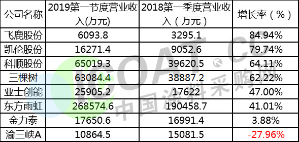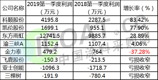 就上表各企業公布的季度報來看,飛鹿股份較2018年同期增幅最為明顯,漲幅達到84.94%,凱倫股份、科順股份、三棵樹的等企業增幅都在50%以上,就以上數據來看,只有渝三峽處于下降狀態,下降幅度達到27.96%。