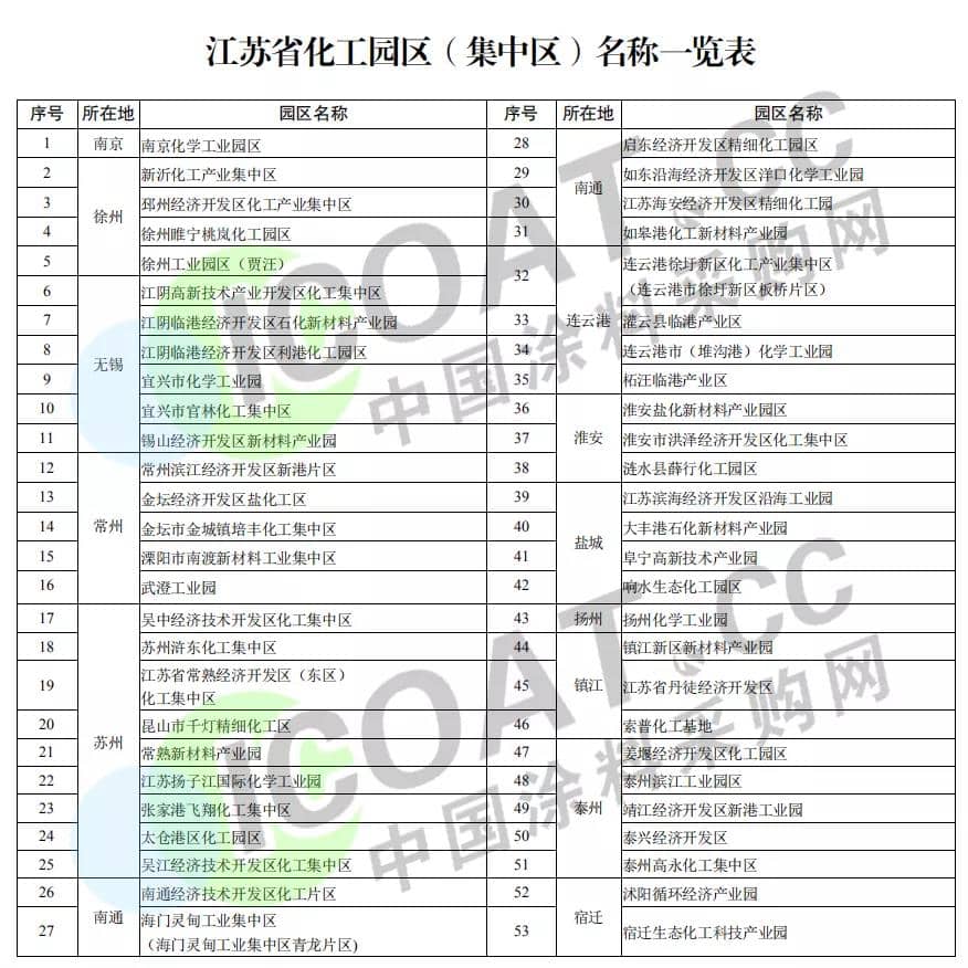 近期江蘇省發布《江蘇省化工產業安全環保整治提升方案》(以下簡稱《方案》),《方案》中對園區和企業的數量調整采取了更加謹慎的態度,要求壓減沿江地區化工生產企業、環境敏感區域化工生產企業、規模以下化工生產企業、園區外化工生產企業的數量,以及加快推進城鎮人口密集區危化品企業搬遷改造。《方案》指出,沿長江干支流兩側1公里范圍內且在化工園區外的企業原則上2020年底之前全部退出或搬遷,對評估安全和環保風險不達標的企業2020年底前全部關閉退出……從征求意見稿到《方案》,多個利益涉及方經過了較長時間的博弈,修改后的《方案》核心目標是重塑江蘇化工產業新格局,通過整治提升行動實現"本質安全根本提升"、"區域布局明顯優化"、"低端產能大幅減少",要建設符合產業發展規律、循環發展和產業鏈完善的綠色安全、現代高端化工產業。江蘇省政府發布53家化工園區如下:
