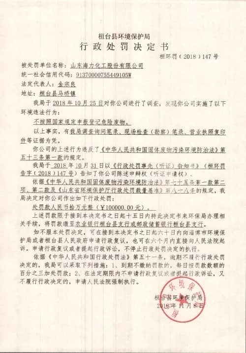 2018年山東海力被當(dāng)?shù)丨h(huán)保局處罰