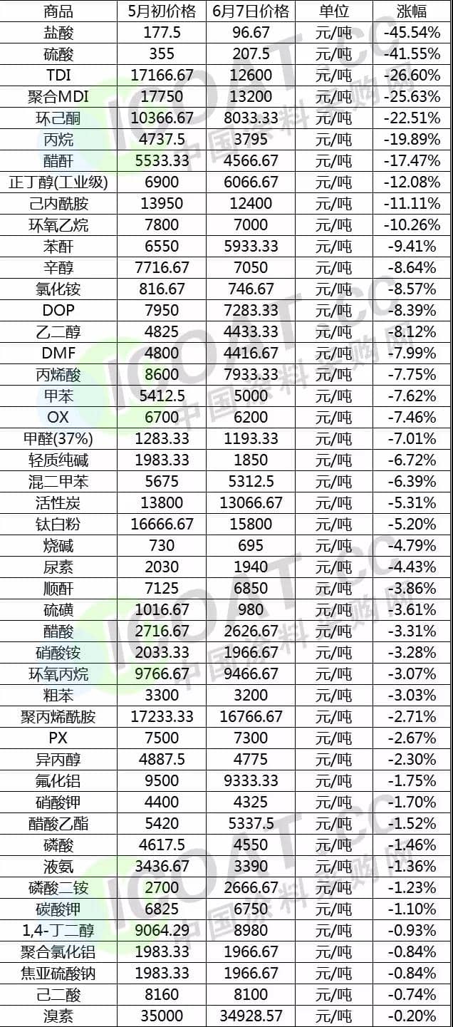 根據上表可以看出,原材料跌幅前三名為鹽酸,硫酸和TDI,跌幅分別為45.54%,41.55%,26.60%。其中鹽酸的跌幅接近50%,位列榜首,這些原材料廣泛用于冶金、石油、聚氨酯及涂料行業等,是重要的化工原材料。