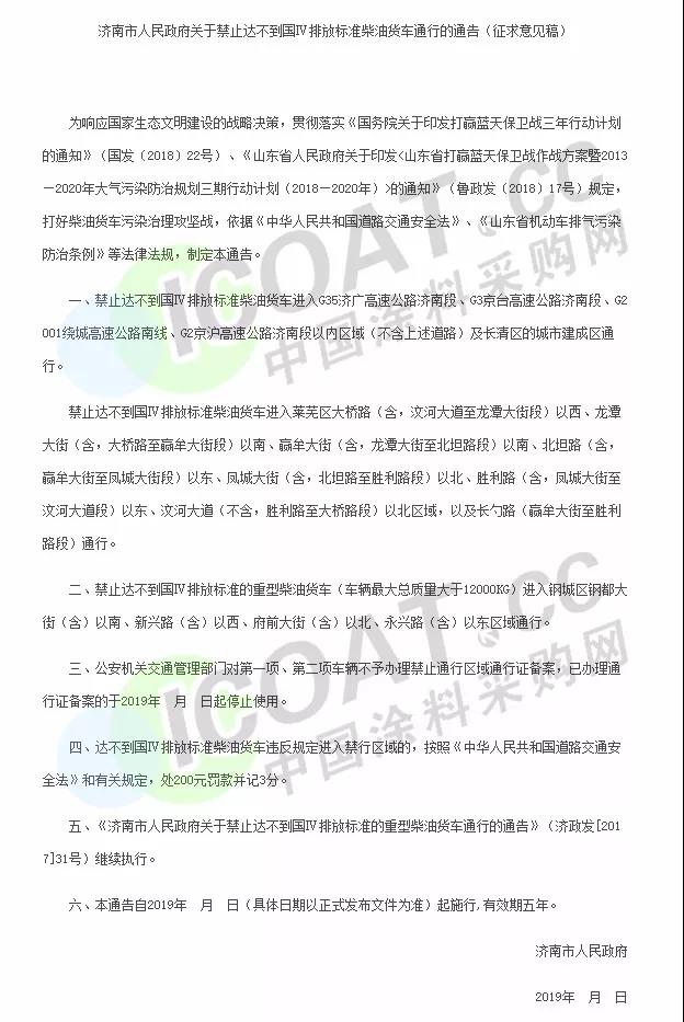 山東濟(jì)南市公安局發(fā)布《濟(jì)南市人民政府關(guān)于禁止達(dá)不到國排放標(biāo)準(zhǔn)紫油貨車通行的通告(征求意見稿)》,通告將將禁止達(dá)不到國Ⅳ排放標(biāo)準(zhǔn)柴油貨車進(jìn)入濟(jì)南市部分路段。屆時(shí)達(dá)不到國Ⅳ排放標(biāo)準(zhǔn)柴油貨車違反規(guī)定進(jìn)入禁行區(qū)域的,按照《中華人民共和國道路交通安全法》和有關(guān)規(guī)定,處200元罰款并記3分。