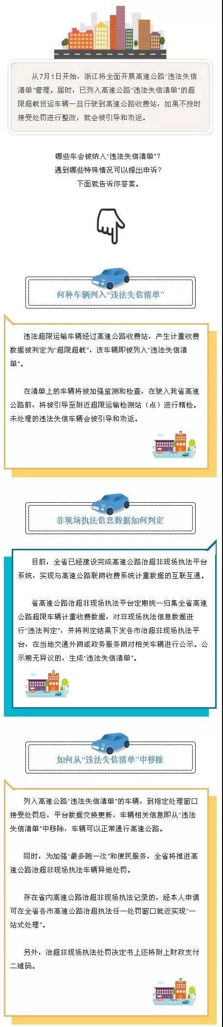 浙江省7月1日開始,浙江將全面開展高速公路“違法失信清單”管理。屆時(shí),已列入高速公路“違法失信清單”的超限超載貨運(yùn)車輛一旦行駛到高速公路收費(fèi)站,如果不按時(shí)接受處罰進(jìn)行整改,就會(huì)被引導(dǎo)和勸返。