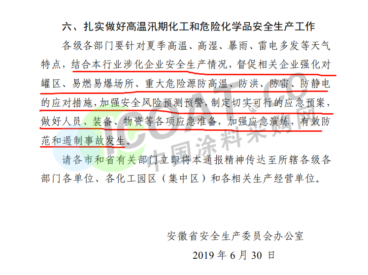 各級各部門要針對夏季高溫、高濕、暴雨、雷電多發等天氣特點,結合本行業涉化企業安全生產情況,督促相關企業強化對罐區、易燃易爆場所、重大危險源防高溫、防洪、防雷、防靜電的應對措施。