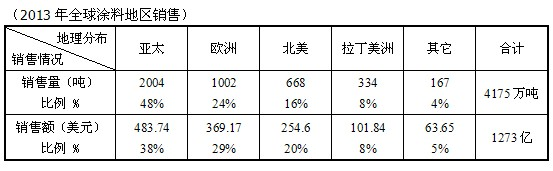 從地理分布上來看,2013年增長最迅速的是發展中的新興市場,特別是亞太地區,占全球的48%。亞太涂料市場主要推動經濟增長的市場包括中國,印度和印度尼西亞。歐洲代表全球涂料的第二大區域市場,其次是北美和拉丁美洲,尾隨在分析期間的年復合增長率為5.1%。(參見下表)