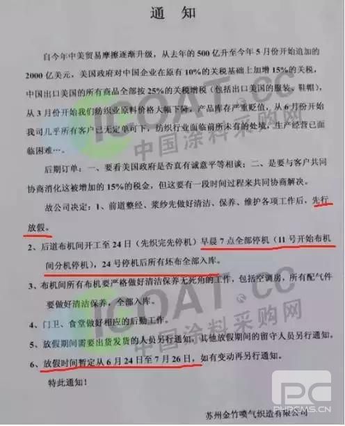 近日,蘇州某紡織企業(yè)發(fā)布通知稱,由于紡織業(yè)原料價格大幅下降,產(chǎn)品庫存嚴(yán)重貶值,幾乎所有客戶已無定向單可下,紡織行業(yè)面臨前所未有的處境,生產(chǎn)經(jīng)營已面臨困難,因此,經(jīng)該公司高層研究決定,自6月24日至7月26日放假,如有變動再另行通知。