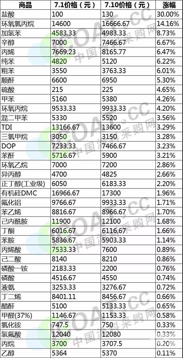 而近期國際油價持續(xù)大漲,也直接推動了國內(nèi)化工原材料的價格上漲。在短短十天時間內(nèi),部分原材料漲價幅度高達30%。以下為涂料采購網(wǎng)統(tǒng)計的7月初至7月10日化工原材料價格漲幅榜。