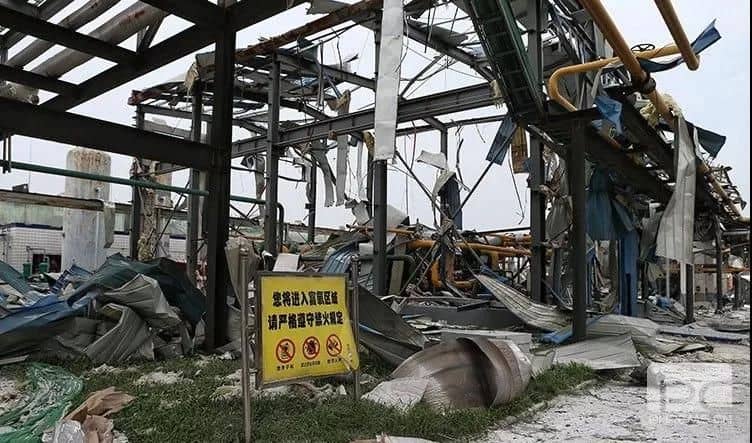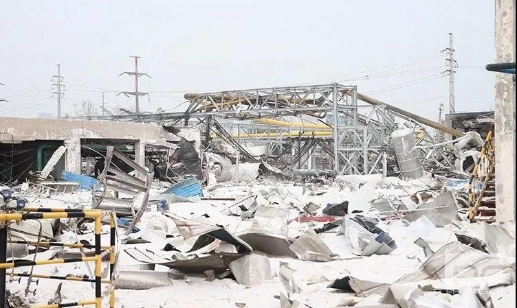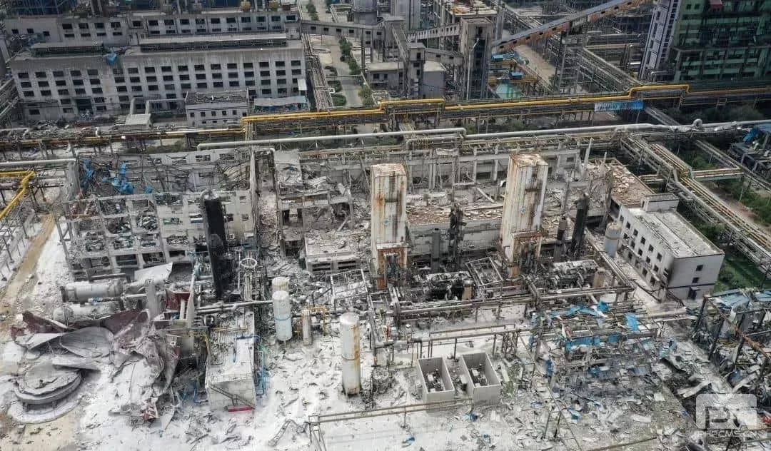 航拍爆炸事故現(xiàn)場,廠區(qū)建筑僅剩框架