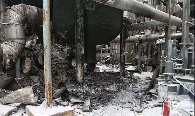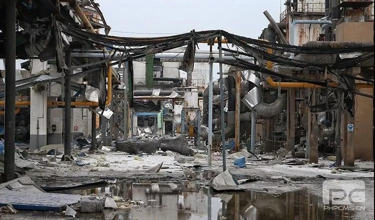 廠區(qū)內(nèi),爆炸灼燒后的工業(yè)設施。
