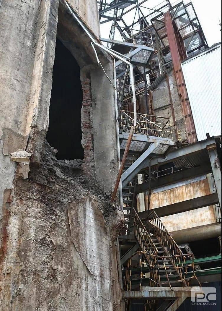 廠區(qū)內(nèi),窗戶被炸沒了,樓梯變形。
