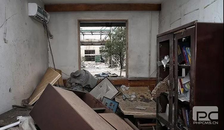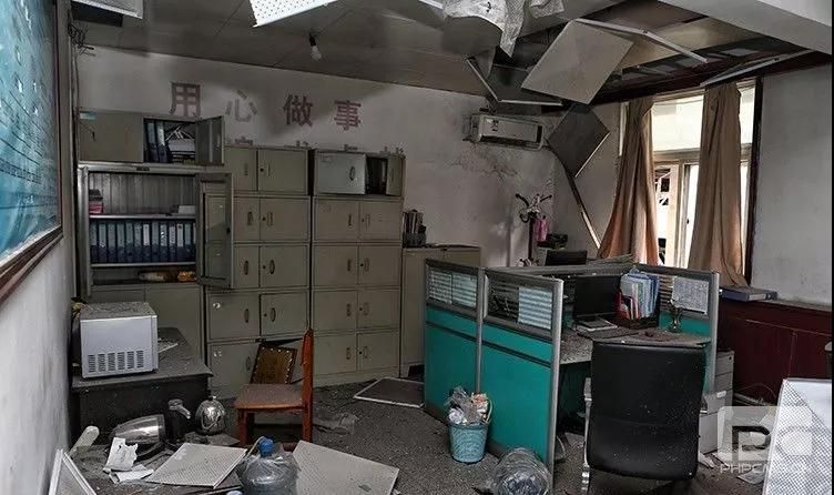 廠區(qū)內(nèi)一間辦公室,窗戶已經(jīng)被炸飛,家具被氣浪沖倒。