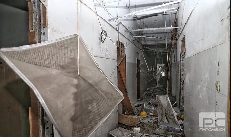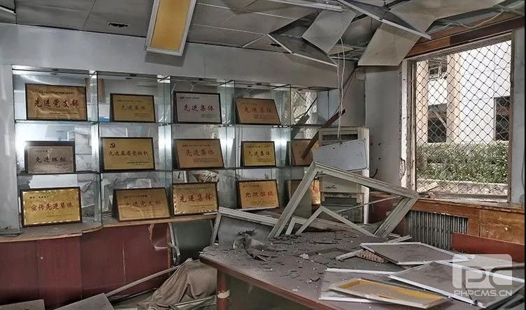 廠區(qū)內(nèi)樓道,天花板掉落,門全部炸飛。