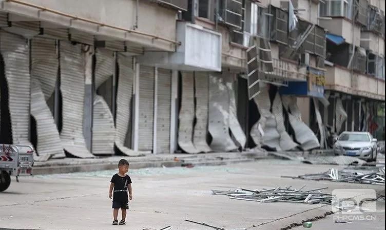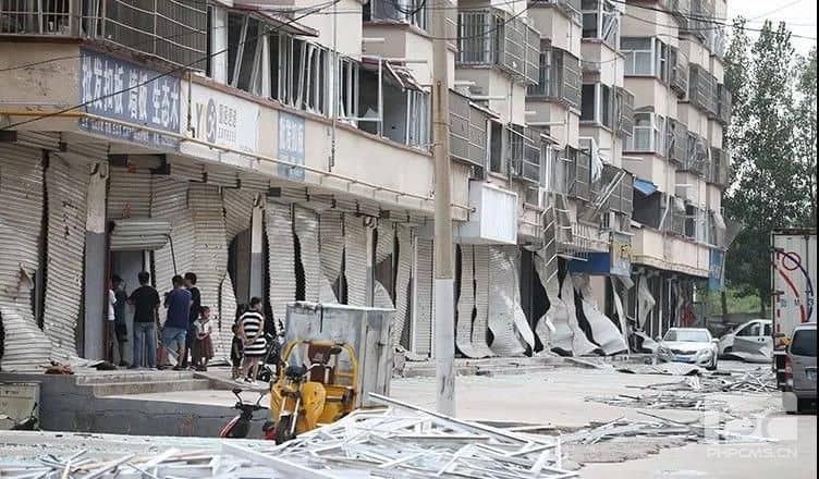 廠區(qū)附近街道,居民樓底層的卷簾門全部扭曲變形。