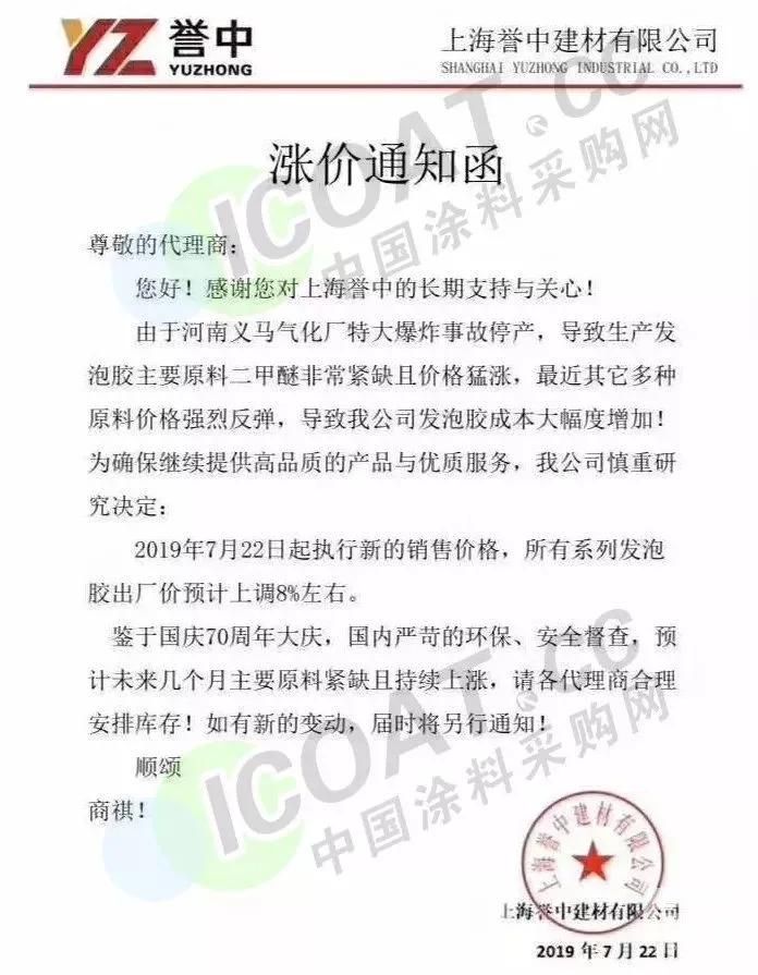 昨日(22日),上海譽中建材有限公司發布漲價通知稱,由于河南義馬氣化廠特大爆炸事故停產,導致生產發泡膠主要原料二甲醚非常緊缺且價格猛漲,最近其它多種原料價格強烈反彈,導致上海譽中發泡膠成本大幅度增加!為確保繼續提供高品質的產品與優質服務,上海譽中決定自2019年7月22日起執行新的銷售價格,所有系列發泡膠出廠價預計上調8%左右。