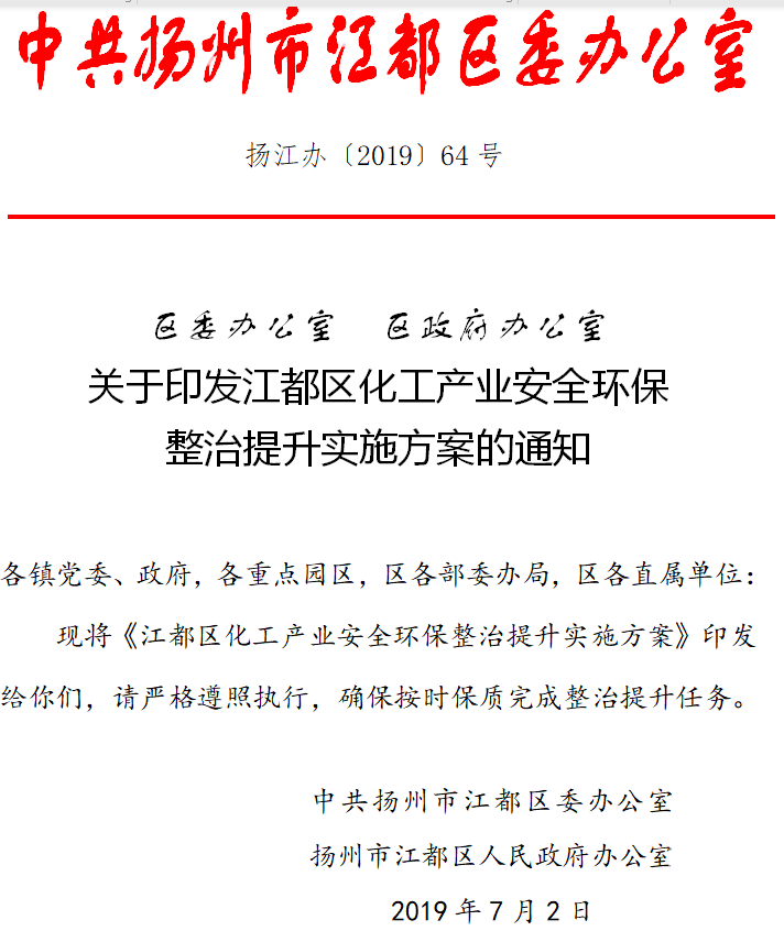 為認真貫徹落實省委辦公廳、省政府辦公廳《關于印發<江蘇省化工產業安全環保整治提升方案>的通知》(蘇辦〔2019〕96號)(以下簡稱《省方案》)和市委辦公室、市政府辦公室《關于印發<揚州市化工產業安全環保整治提升實施方案>的通知》(揚辦〔2019〕76號)(以下簡稱《市方案》)精神,結合我區實際,特制定本方案。