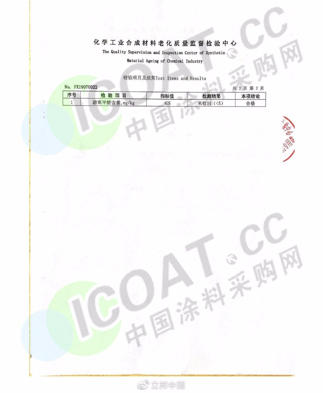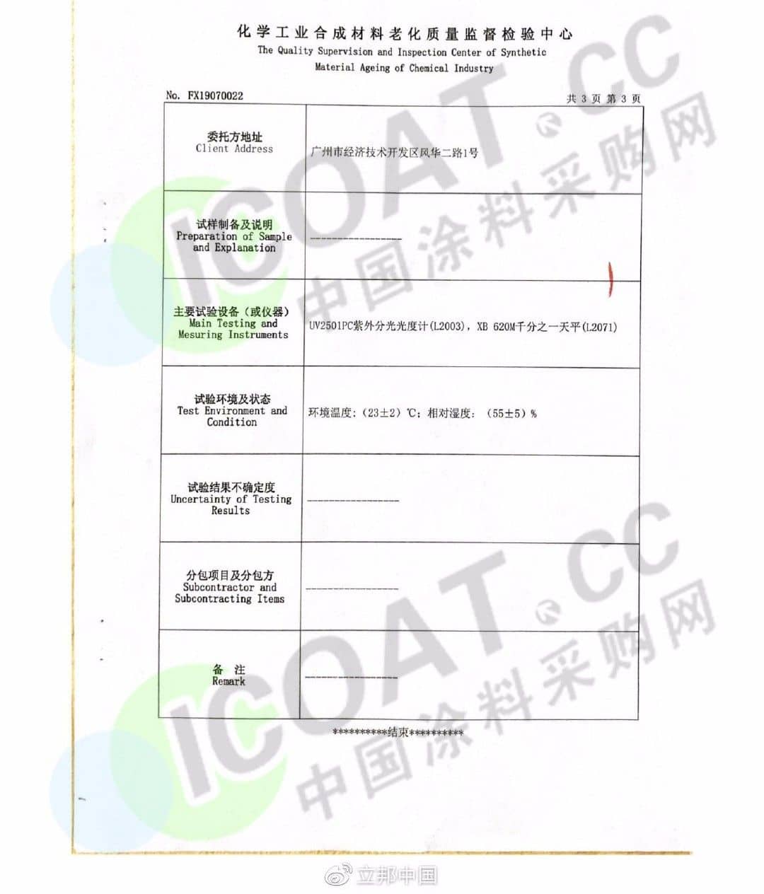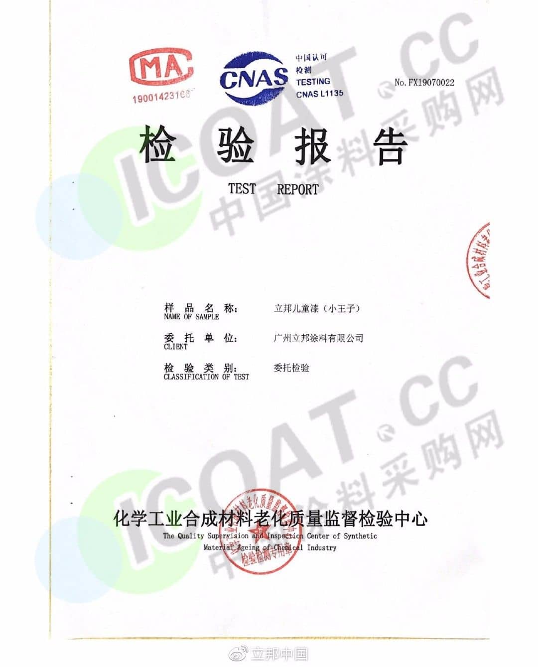 出于對社會負責、對消費者負責的目的,7月4日,廣州立邦涂料有限公司委托具有國家評定檢驗資質的第三方機構“化學工業合成材料老化質量監督檢驗中心”,送檢立邦兒童漆(小王子),生產日期:2019年5月23日,生產批號:1904252D58,根據GB/T 34676-2017兒童房裝飾用內墻涂料為檢驗依據,對“有害物質限量要求”進行檢驗,檢驗結果:未檢出(<5)。