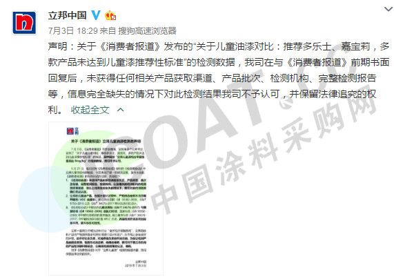 7月3日,《消費者報道》發布“兒童油漆對比:推薦多樂士、嘉寶莉,多款產品未達到兒童漆推薦性標準”的報道,其中提到“立邦兒童漆”的檢測數據,我司不予認可。早在5月,我司就已向《消費者報道》就檢測產品的真實有效、檢測機構的資質、檢測方式的正確性,提出書面質疑及回復,《消費者報道》未就我司的回復,提供任何可保證本次檢測真實有效的信息。