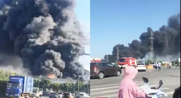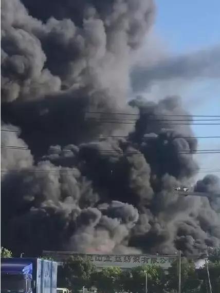 據通訊員提供的現場視頻顯示,一處寫有“昆山立益紡織有限公司”的圍墻內,有滾滾濃煙冒出,達10余米高,濃煙中夾雜著明火。事發地點緊鄰馬路,路上停放在多輛貨車,不時有行人在事發地點附近穿梭。