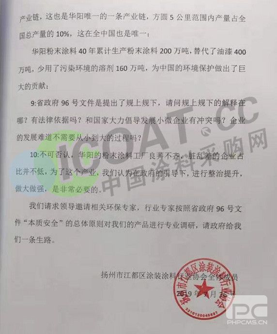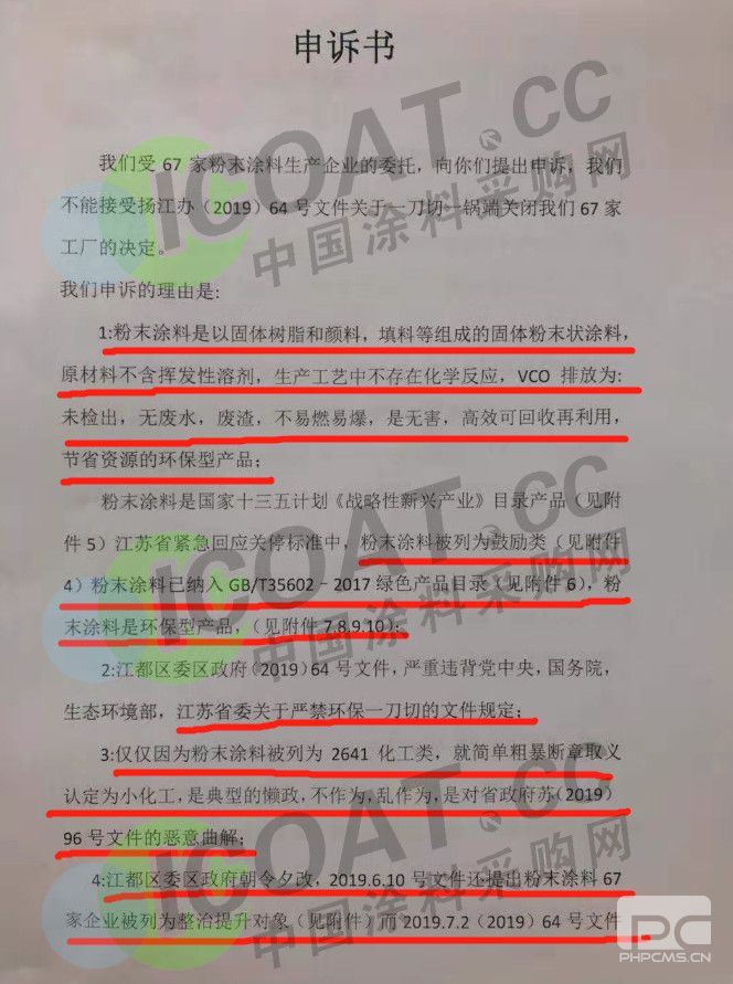 據《申訴書》相關內容顯示,揚州市江都區涂裝涂料行業協會受67家粉末涂料生產企業的委托,不能接受揚江辦(2019)64號文件關于一刀切關閉67家工廠的決定,并提出了十條申訴理由,具體內容如下: