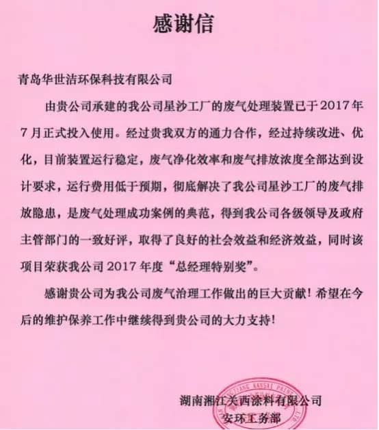 湘江關(guān)西涂料感謝信中稱,自華世潔承建湘江關(guān)西涂料星沙工廠的廢氣處理裝置投入使用以來,經(jīng)過持續(xù)性改進(jìn)、優(yōu)化,目前該裝置運(yùn)營(yíng)穩(wěn)定,廢氣凈化效率和廢氣排放濃度全部達(dá)到設(shè)計(jì)要求,運(yùn)行費(fèi)用低于預(yù)期,徹底解決了廢氣排放隱患,是廢氣處理成功案例的典范,得到了湘江關(guān)西各級(jí)領(lǐng)導(dǎo)及政府主管部門的一致好評(píng),取得了良好的社會(huì)效益和經(jīng)濟(jì)效益。