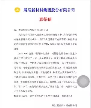 國(guó)內(nèi)建筑涂料龍頭企業(yè)之一的展辰新材料集團(tuán)股份有限公司也對(duì)華世潔的產(chǎn)品及服務(wù)非常滿意,并給華世潔發(fā)來了表揚(yáng)信稱,在展辰珠海公司的廢氣設(shè)備施工過程中,華世潔的伊斯南先生表現(xiàn)出其專業(yè)性,指揮工人現(xiàn)場(chǎng)施工有條不紊,并能在規(guī)定的時(shí)間內(nèi)完成制定的計(jì)劃工程,如今RTO設(shè)備、吸附回收設(shè)備、濾筒除塵設(shè)備的3套主體設(shè)備已經(jīng)全面完工,施工過程中伊斯南先生嚴(yán)格遵守展辰的安全管理制度,施工中無異常,無事故。同時(shí)也給展辰提出很多經(jīng)濟(jì)的改善方案。