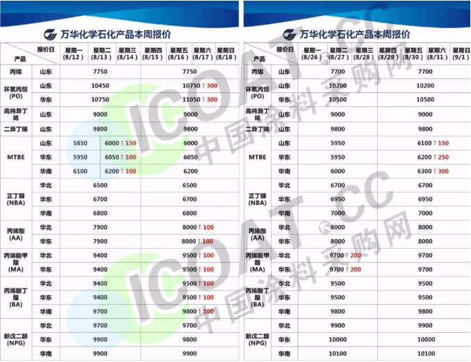 以國(guó)內(nèi)化工巨頭萬(wàn)華化學(xué)為例,根據(jù)萬(wàn)華化學(xué)發(fā)布的產(chǎn)品報(bào)價(jià)來(lái)看,近1個(gè)月內(nèi),萬(wàn)華化學(xué)MTBE報(bào)價(jià)上漲兩次,分別為山東地區(qū)價(jià)格上調(diào)150元/噸漲至6000元/噸,而后上調(diào)150元/噸漲至6100元/噸;華東地區(qū)價(jià)格上調(diào)100元/噸漲至6050元/噸,而后上調(diào)250元/噸漲至6200元/噸;華南地區(qū)價(jià)格上調(diào)100元/噸漲至6200元/噸,而后上調(diào)300元/噸漲至6300元/噸。丙烯酸甲酯(MA)也經(jīng)歷了兩次漲價(jià),華北地區(qū)、華東地區(qū)價(jià)格均上調(diào)100元/噸漲至9500元/噸,而后上調(diào)200元/噸漲至9700元/噸;