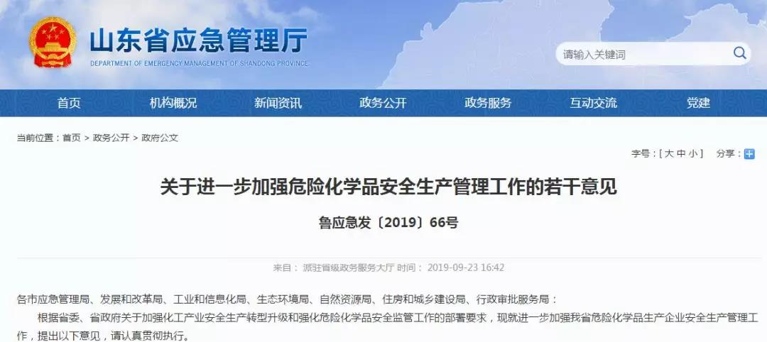 近日,山東省應急管理廳、山東省生態環境廳等7部門聯合發布了《關于進一步加強危險化學品安全生產管理工作的若干意見》的通知。《意見》要求從嚴控制危險化學品建設項目、提高危險化學品生產企業安全管理水平、堅決關閉不具備安全生產條件企業,《意見》自2019年9月20日起施行,有效期至2022年9月19日。