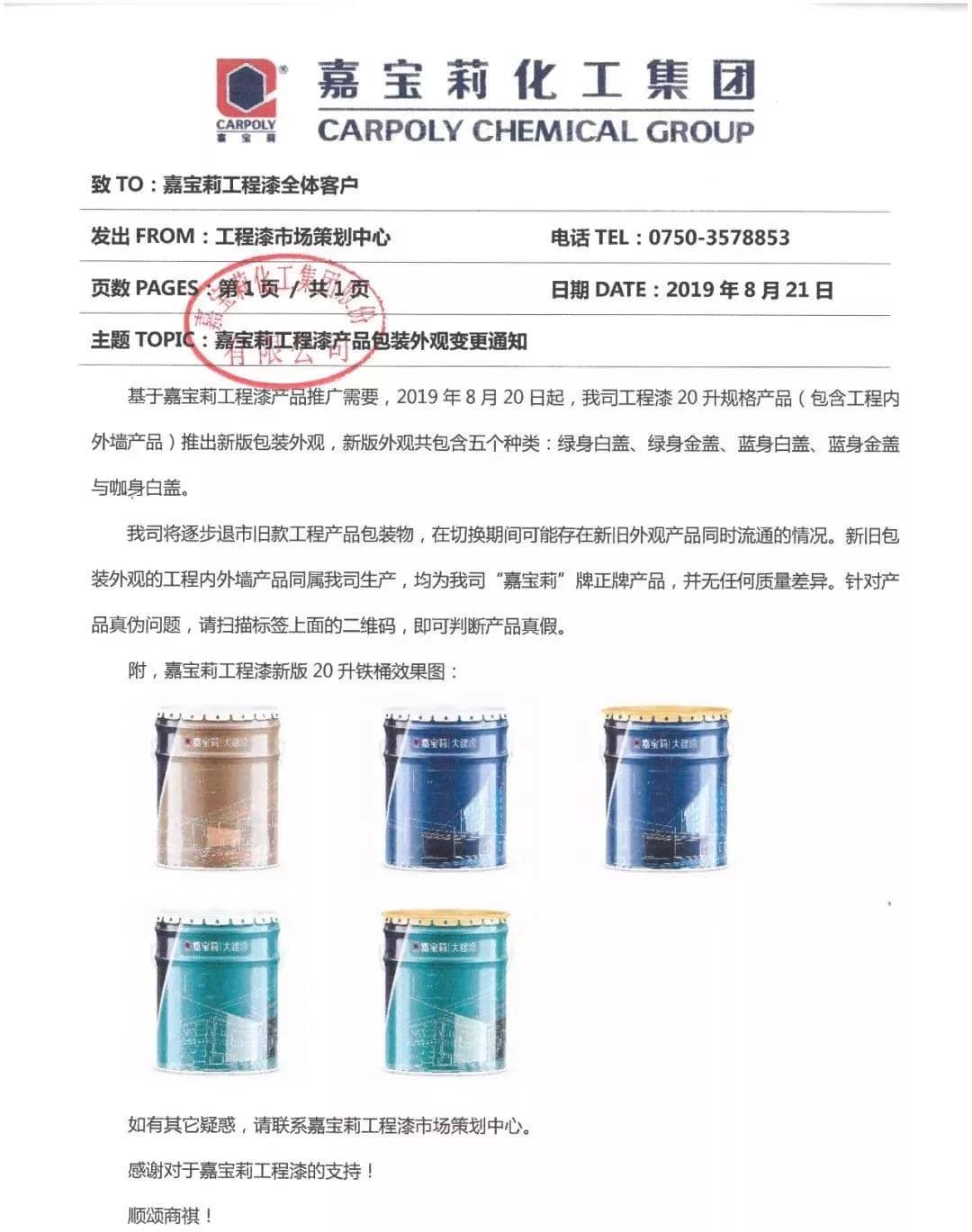 基于嘉寶莉工程漆產品推廣需要,2019年8月20日起,嘉寶莉工程漆20升規格產品(包含工程內外墻產品)推出新版包裝外觀,新版外觀共包含五個種類:綠身白蓋、綠身金蓋、藍身白蓋、藍身金蓋與咖身白蓋?! 〖螌毨驅⒅鸩酵耸信f款工程產品包裝物,在切換期間可能存在新舊外觀產品同時流通的情況。新舊包裝外觀的工程內外墻產品同屬嘉寶莉生產,均為“嘉寶莉”牌正牌產品,并無任何質量差異。針對產品真偽問題,請掃描標簽上面的二維碼,即可判斷產品真假。