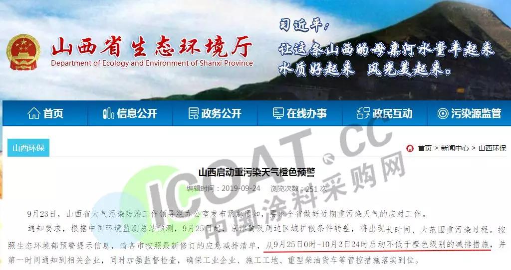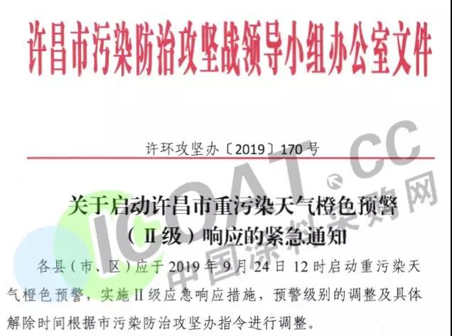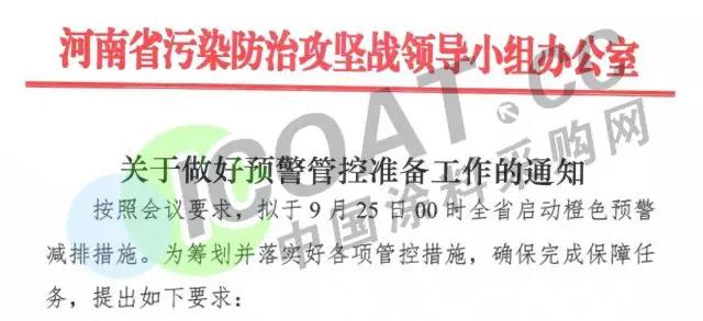 太原:9月25日0時-10月2日24時啟動重污染天氣應急預案橙色(二級)響應。施工工地、工業企業廠區及工業園內停止使用國二及以下非道路移動機械(清潔能源和緊急搶修作業機械除外);化工等重點行業涉及大宗物料運輸的企業按照“工業源減排清單”中橙色預警車輛運輸減排要求執行;除應急搶險外,所有施工工地的噴涂粉刷等易起塵作業全部停止。 晉城:從2019年9月25日0時00分啟動重污染天氣橙色預警(Ⅱ級),同時將加強空氣質量研判,若持續加重惡化,將適時啟動重污染天氣紅色預警(I級)。涉VOCs排放企業使用粉末、水性、高固體分、紫外光固化等低VOCs含量涂料的VOCs排放工序停產50%(含)以上,以生產線計;使用其他高VOCs含量涂料的企業涉VOCs排放工序停產。河南 9月25日0時及時啟動橙色預警減排措施。各地減排措施要滿足揮發性有機物的減排比例達到全社會排放量的20%以上。