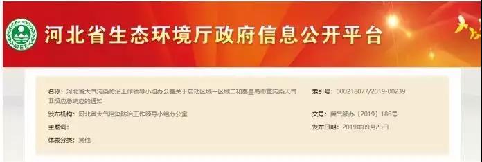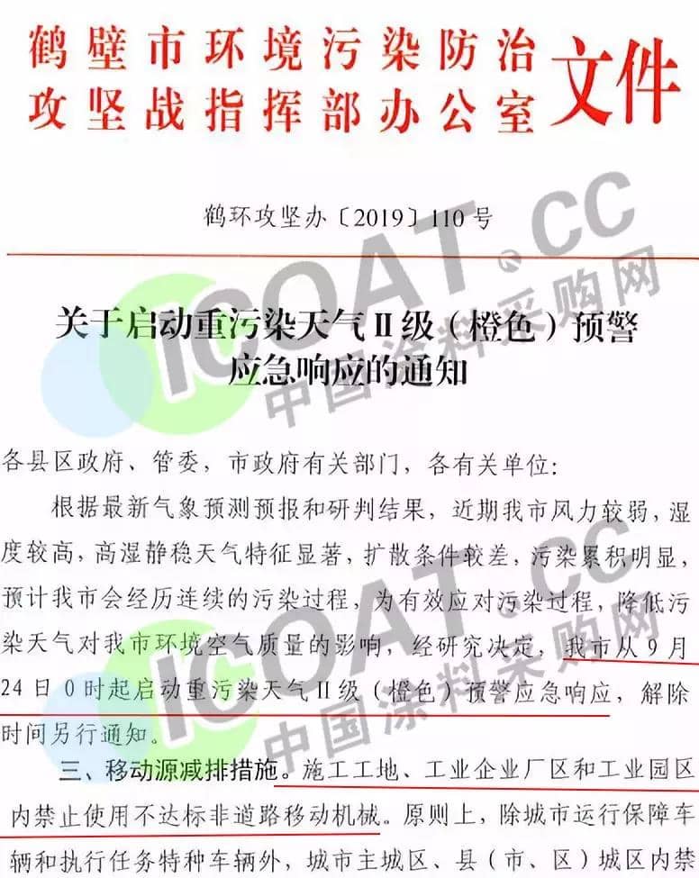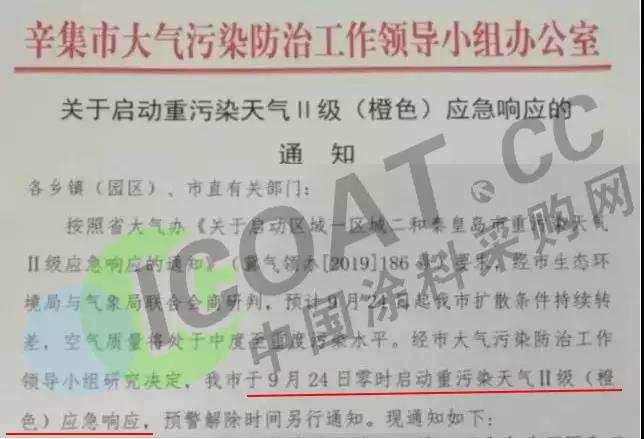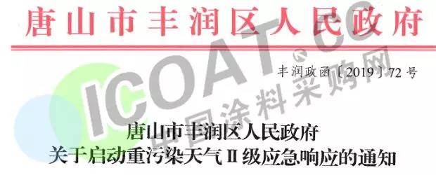 邯鄲:自2019年9月23日24時起,發布重污染天氣橙色預警啟動II級應急響應強化措施,化工、涂裝、印刷等涉塵、涉氣排放重點行業企業全部停產。所有施工工地停止一切室外施工作業,室內施工不得進行涉塵、涉氣作業。 唐山豐潤:9月24日0時全區啟動重污染天氣II級應急響應。家具行業調漆、供漆、涂裝、等涉VOCs排放工序停產。施工工地、工業企業廠區和工業園區內停止使用國二及以下非道路移動機械。施工工地停止噴涂粉刷、護坡噴漿等。