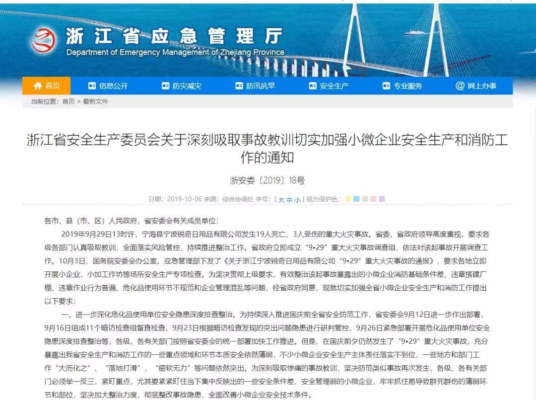10月6日,浙江省應急管理廳發布了《浙江省安全生產委員會關于深刻吸取事故教訓切實加強小微企業安全生產和消防工作的通知》,稱省政府立即成立了“9•29”重大火災事故調查組,對該起事故開展調查工作,并要求各級各部門認真吸取教訓,全面落實風險管控,持續推進整治工作。