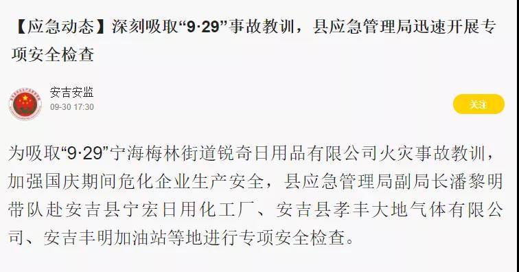 浙江省湖州市安吉縣應急管理局深刻吸取“9.29”事故教訓,迅速開展了專項安全檢查。由縣應急管理局副局長親自帶隊赴區域內相關企業進行專項安全檢查。