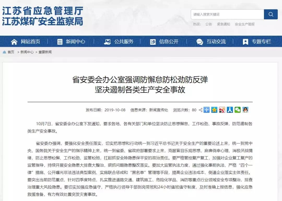 10月7日,江蘇省安委會辦公室下發通知,要求各地、各有關部門和單位堅決防止思想懈怠、工作松勁、事故反彈,防范遏制各類生產安全事故。