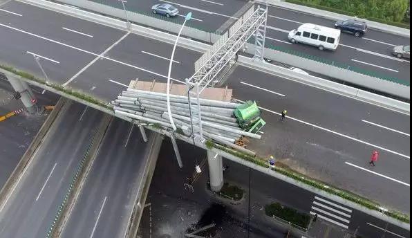 上海中環線高架內圈滬嘉立交出口至滬太路上匝道之間發生一起貨車單車事故,導致車上裝載的水泥管樁散落,部分管樁翻落至地面道路,事故造成中環高架主線橋體內側翹起移位。