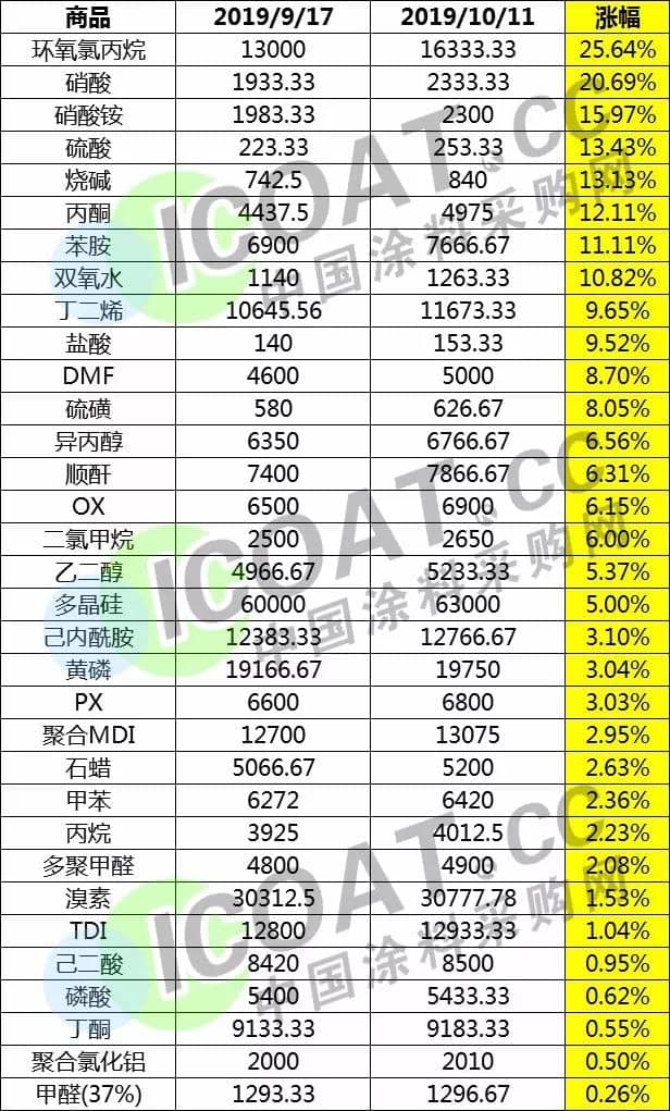 通過以上表格數據可以看出,近期共33種原材料價格上漲,在此次統計數據中占42%。其中漲幅最高的為環氧氯丙烷,價格上漲25.64%,其于2019年價格變動非常活躍。硝酸和硝酸銨緊隨其后,漲幅分別為20.69%和15.97%。 10月12日市場獲悉,滄州大化TDI一口價上調至13200元/噸。 10月12日,華北地區鹽酸主流出廠價格微漲:德州邁化報價60元/噸,報價微漲,漲幅10元/噸。 10月12日,山東華魯恒升液氨報價調漲50元/噸,報價3050元/噸。 10月12日,山東舜天液氨價格報價調漲50元/噸,價格3650元/噸。 10月11日市場獲悉,萬華化學本周TDI掛牌價執行14500元/噸,上調500元/噸,節前結算12700元/噸。 10月11日,上海巴斯夫TDI 10月份掛牌價格17000元/噸(桶裝),環比上調1000元/噸。 10月11日,山東海右石化集團有限公司(晨曦)丙烯最新報價上調,漲150元/噸至7600元/噸。 10月11日,江蘇新海石化有限公司聚合級丙烯報價上調,漲50元/噸至7600元/噸。 10月11日,山東東明石化集團(潤昌)氣分含硫裝置丙烯最新報價上調50元/噸至7450元/噸,山東東明石化集團(前海)混烷脫氫裝置丙烯最新報價上調50元/噸至7600元/噸。 除了巴斯夫、萬華化學、滄州大化之外,還有不少企業、地區等提高了化工原材料的價格。據業內人士稱,近期國際政局的動蕩對國內市場產生的影響較大,部分化工企業的原材料漲價也會領漲其他原材料的價格,而國內大部分化工原材料價格的上漲或許只是時間問題。