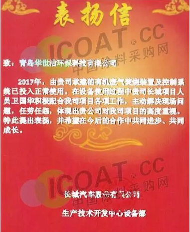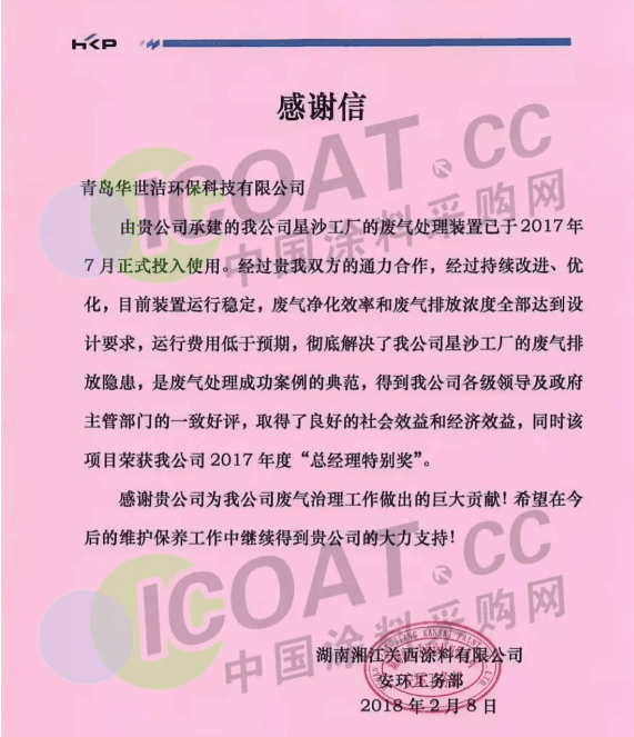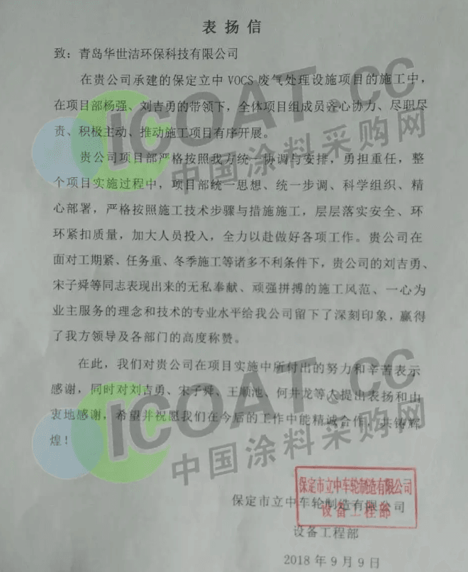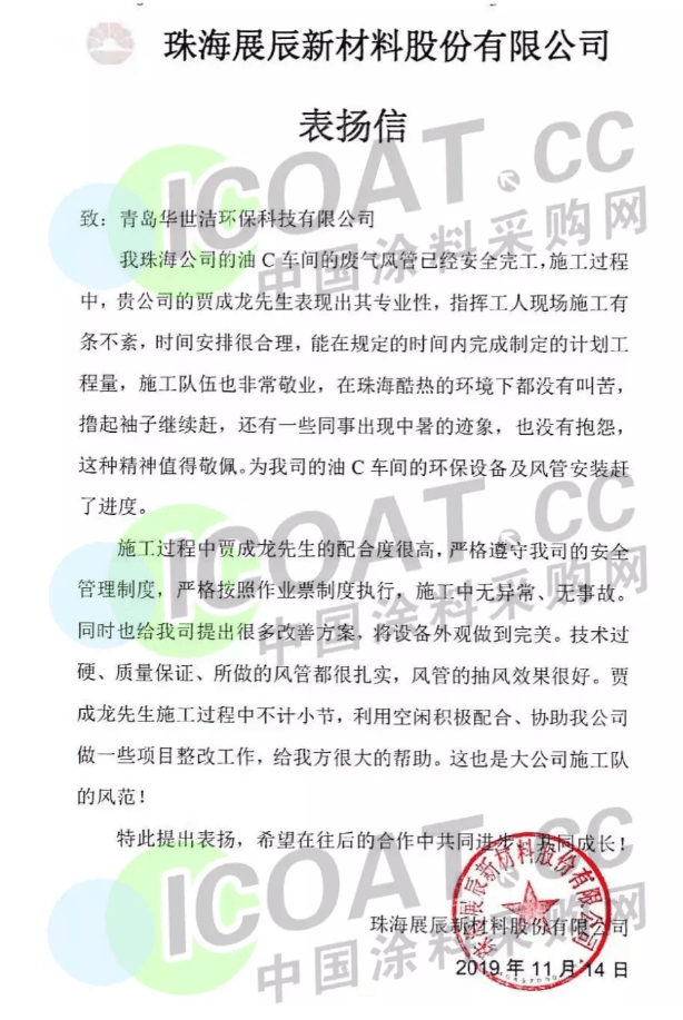 01 、珠海展辰新材料股份有限公司廢氣處理項目 11月14日,華世潔收到珠海展辰新材料股份有限公司發來的表揚信,信中寫道:“施工過程中,貴公司的賈成龍先生表現出其專業性,指揮工人現場施工有條不紊,時間安排很合理,能在規定時間內完成制定的計劃工程量,施工隊伍也非常敬業,在珠海酷熱的環境下都沒有叫苦,有一些同事出現了中暑的跡象,但是沒有任何一個人抱怨,大家仍然奮戰在一線,這種精神值得敬佩。”