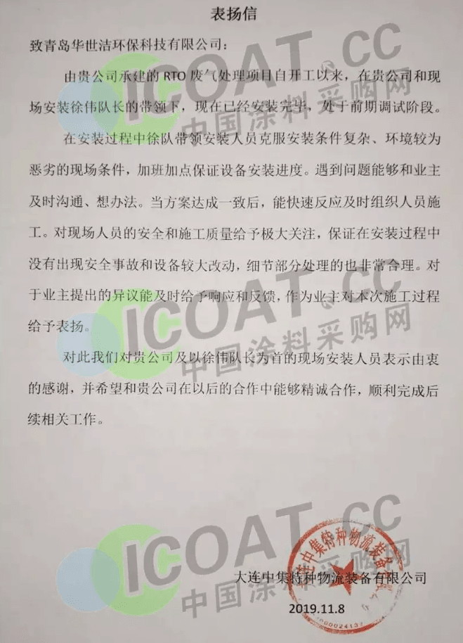 華世潔安裝團隊的高效和專業的服務獲得了客戶的認可,11月8日大連中集特種物流裝備有限公司特別發送表揚信到公司,以示感謝和鼓勵,并希望和華世潔在以后的合作中能夠精誠合作,順利完成后續相關工作。