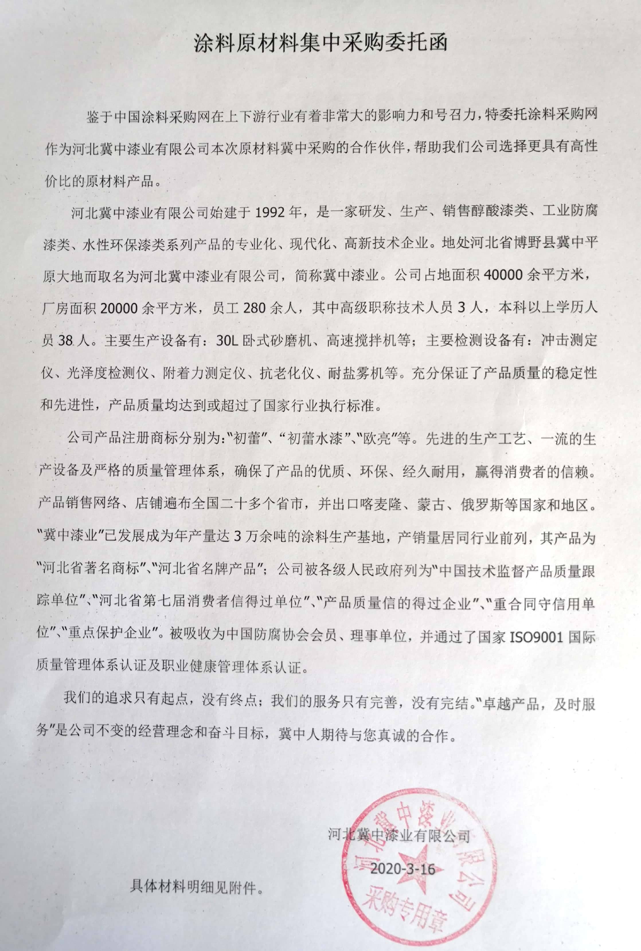 近日,涂料采購網(wǎng)收到河北冀中漆業(yè)有限公司發(fā)來的《涂料原材料集中采購委托函》稱,鑒于涂料采購網(wǎng)在上下游行業(yè)有著非常大原影響力和號召力,特委托涂料采購網(wǎng)作為河北冀中漆業(yè)有限公司原材料集中采購的合作伙伴,協(xié)且河北冀中漆業(yè)有限公司選擇更具有高性價(jià)比的原材料產(chǎn)品。