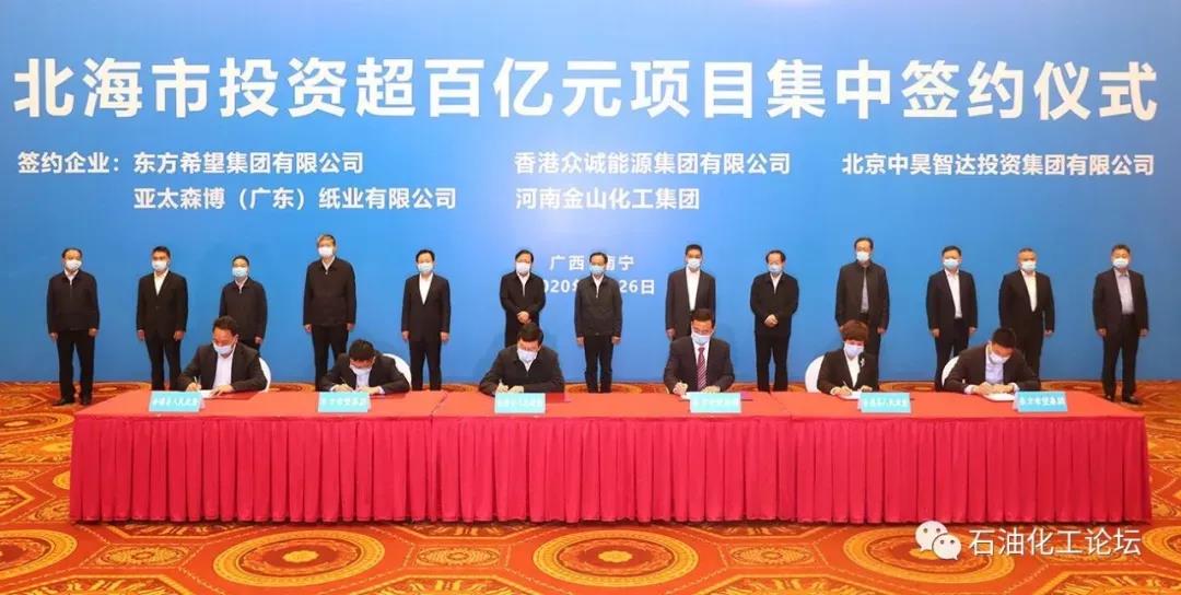 4月26日,北海市舉辦投資超百億元項(xiàng)目集中簽約活動(dòng)。東方希望集團(tuán)投資1100億元規(guī)劃建設(shè)精細(xì)化工產(chǎn)業(yè)園,預(yù)計(jì)年產(chǎn)值1500億元,年利稅400億元。香港眾誠(chéng)能源集團(tuán)投資630億元建設(shè)鐵山港化工新材料項(xiàng)目,河南金山化工集團(tuán)總投資125億元建設(shè)玻璃生產(chǎn)配套暨傳統(tǒng)鹽化工升級(jí)改造項(xiàng)目,該項(xiàng)目計(jì)劃建設(shè)年產(chǎn)聯(lián)堿300萬(wàn)噸、氯化銨330萬(wàn)噸,預(yù)計(jì)年產(chǎn)值75億元,年稅收8億元。