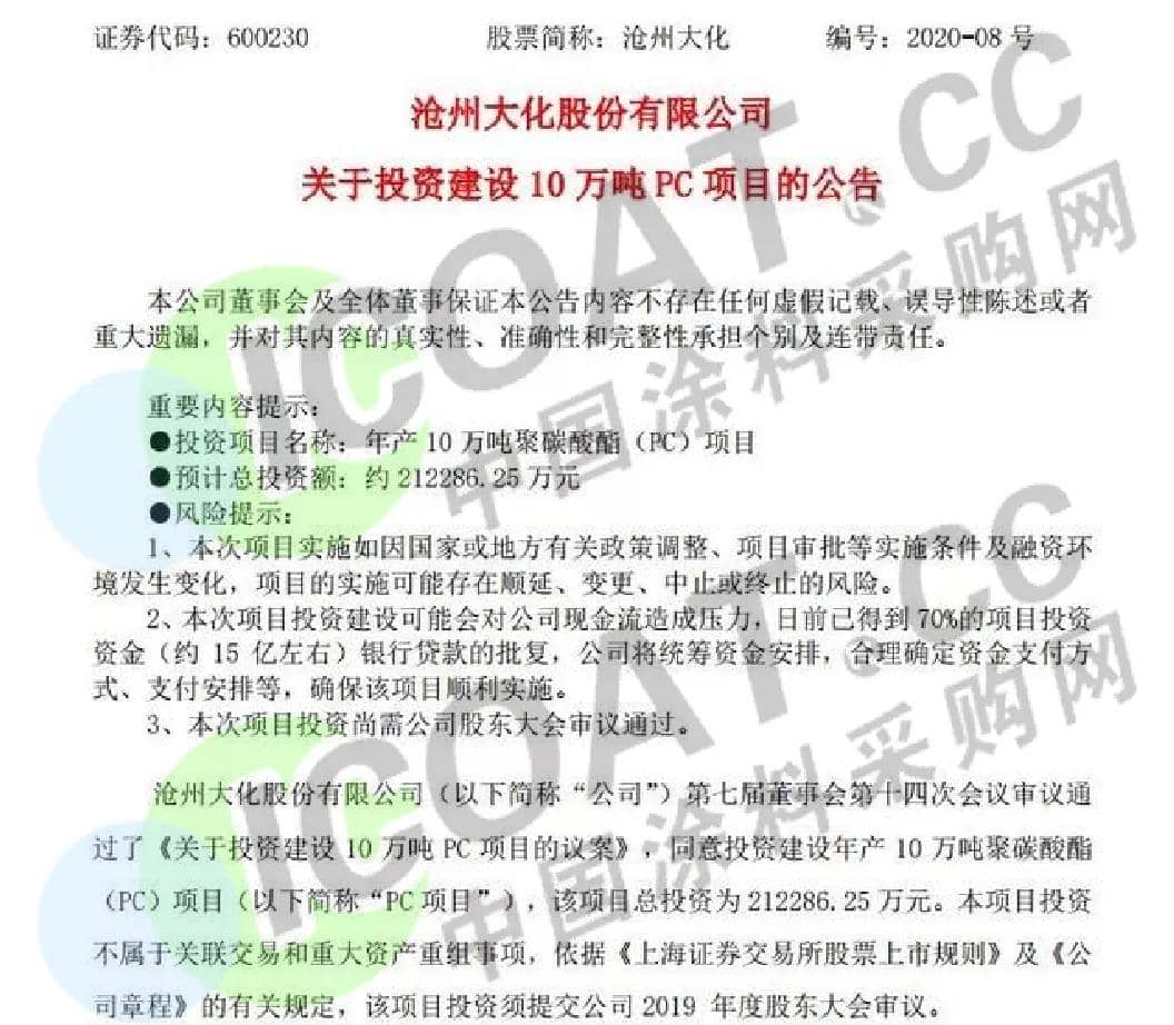 4月24日,滄州大化發(fā)布關(guān)于投資建設(shè)10萬(wàn)噸PC項(xiàng)目的公告。該項(xiàng)目總投資為21.23億,包括年產(chǎn)10萬(wàn)噸PC的生產(chǎn)裝置、輔助生產(chǎn)裝置、公用工程裝置、公用系統(tǒng)、場(chǎng)外工程等建設(shè)。項(xiàng)目預(yù)計(jì)2020年10月建成投產(chǎn)。