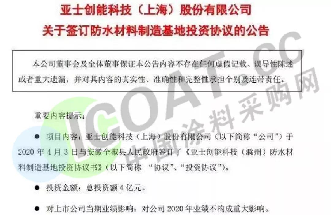 4月3日,亞士創(chuàng)能計(jì)劃在安徽省滁州市全椒縣投資建設(shè)亞士創(chuàng)能科技(滁州)防水材料制造基地。該項(xiàng)目總投資4億元,主要建設(shè)內(nèi)容為瀝青基防水卷材、高分子防水卷材及瀝青類防水涂料。項(xiàng)目建成達(dá)產(chǎn)后,預(yù)計(jì)可實(shí)現(xiàn)年銷售收入12億元。