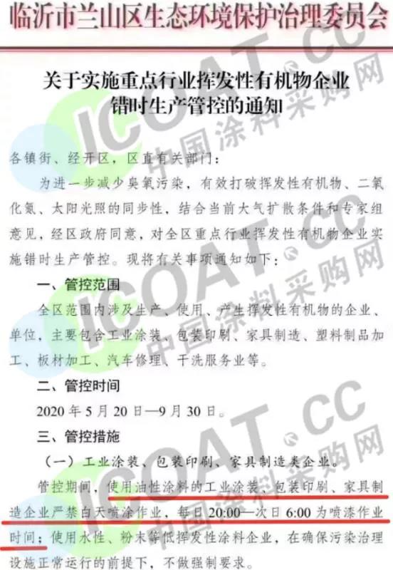 山東省臨沂市蘭山區生態環境保護治理委員會發布通知,稱將對全區重點行業揮發性有機物企業實施錯時生產管控。管控期間,使用油性涂料的工業涂裝、包裝印刷、家具制造企業嚴禁白天噴涂作業,每日20:00-次日6:00為噴漆作業時間;使用水性、粉末等低揮發性涂料企業,在確保污染治理設施正常運行的前提下,不做強制要求。