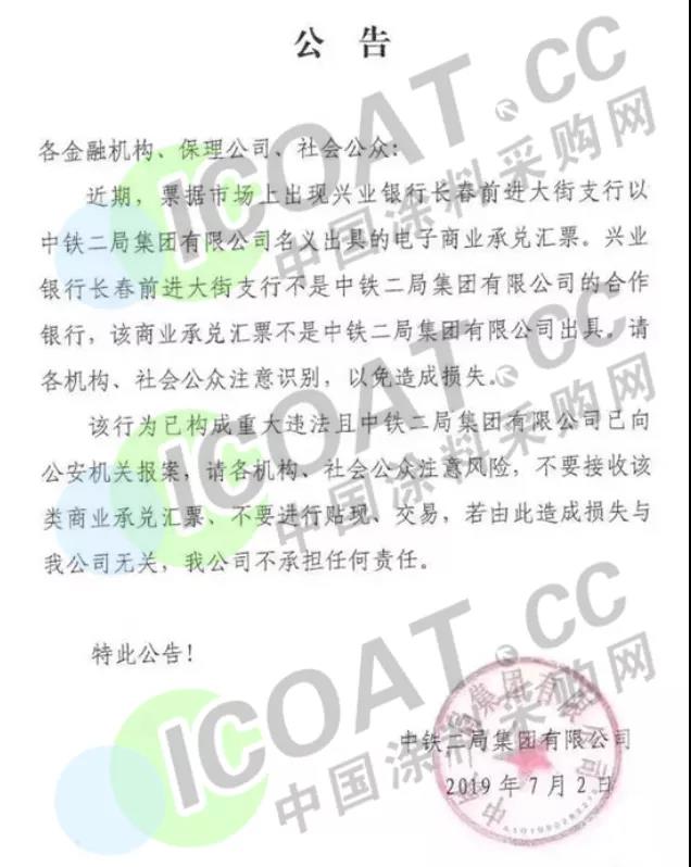 對此中鐵二局集團有限公司緊急發布公告,對這批假承兌匯票情況進行了官方說明: