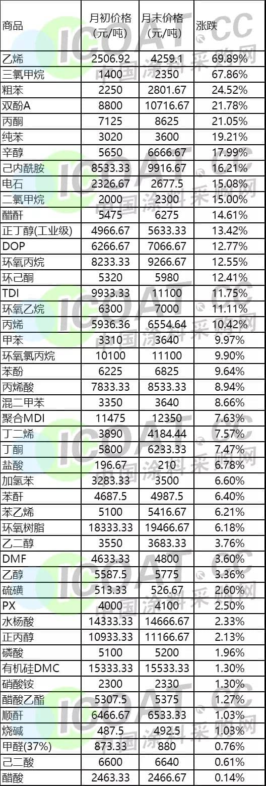 據涂料采購網了解,5月份國內大部分原材料價格出現了不同程度的上漲,6月受國際原油的影響,部分化工原材料產品價格暴漲,乙烯暴漲69.89%,三氯甲烷暴漲67.89%。