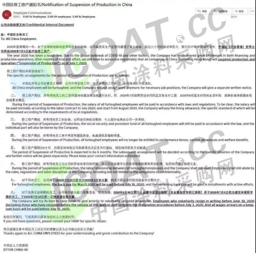 內部郵件顯示,停工停產預計持續6個月。對待崗人員將在7月10日支付3月份的欠薪,剩余欠薪將創造條件分期支付。選擇主動離職人員(需在7月3日前辦理完畢離職手續),7月10日一次性結清全部欠薪。據涂料采購網了解, 進入2020年以來,拜騰汽車陷入經營危機,拖欠員工薪資4個月之久。上海辦公室4月撤租,北京辦公室6月17日撤租,南京工廠近日也因欠費停水斷電關廠。