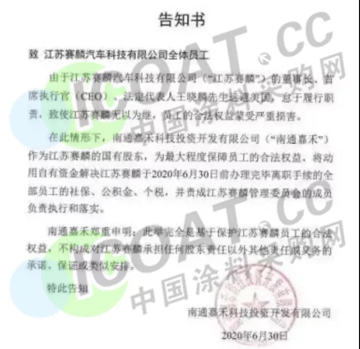6月30日,江蘇賽麟汽車股東——南通嘉禾發布告知書稱,由于江蘇賽麟汽車董事長王曉麟遠避美國,怠于履行職責,使賽麟無以為繼。南通嘉禾作為江蘇賽麟的國有股東,將動用自有資金解決江蘇賽麟于2020年6月30日前辦理完畢離職手續的全部員工的社保、公積金、個稅等,最大程度保障員工權益。值得注意的是,此次南通嘉禾動用自有資金的目的并不包括解決員工拖欠工資問題,僅解決今日前離職全部員工的社保、公積金、個稅。
