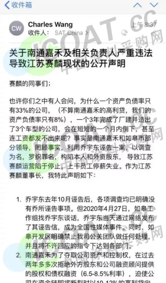 然而,與此同時,遠在美國的王曉麟也通過內部郵件發布了《關于南通嘉禾及相關負責人嚴重違法導致江蘇賽麟現狀的公開聲明》,控訴南通嘉禾利用喬宇東“實名舉報”一事非法侵占公司,導致賽麟汽車運營陷于停滯,上千員工停薪失業。