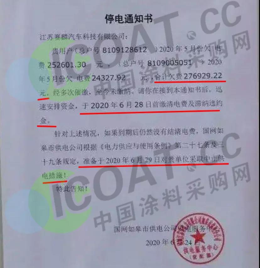 而在此前,網傳江蘇賽麟汽車科技有限公司收到了國網如皋市供電公司的停電通知書,稱由于5月欠費合計276929.22元,經多次催繳但并未繳納,遂通知其6月28日前繳清電費及滯納違約金,否則將于6月29日采取中斷供電措施。