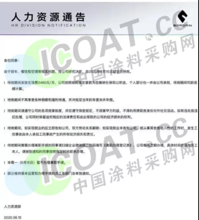 6月15日,博郡汽車人力資源發布通告稱,博郡汽車全員進入待崗狀態。待崗期間,博郡汽車將發放生活費2480元,待崗天數自動沖抵年度未休年假。期間,如果有員工想要離職可以掃描二維碼填表,公司每周定期辦理。
